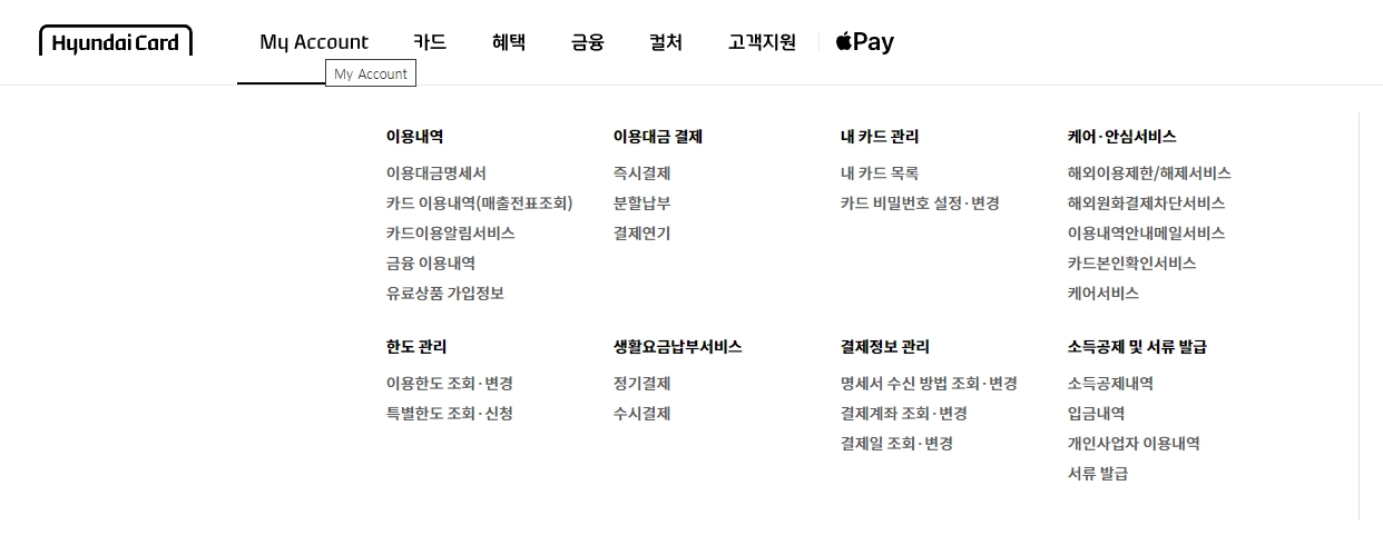 My Account란에는 사용자의 이용 내역을 비롯하여 각종 서비스를 손쉽게 확인할 수 있는 여러 탭들이 준비되어 있습니다. 이곳에서는 사용자가 이용한 금액의 명세서, 카드 이용 내역 조회, 카드 이용 알림 서비스, 금융 이용 내역, 유료 상품 가입 정보 등을 살펴볼 수 있습니다.