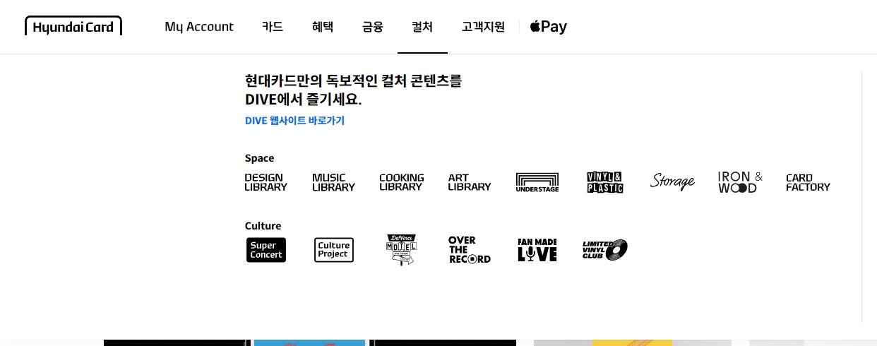 컬쳐 메뉴를 통해서는 현대카드가 제공하는 독특한 문화 콘텐츠를 DIVE를 통해 즐길 수 있습니다. 이곳에서는 다양한 컬처 프로그램과 이벤트 정보를 확인하고, 이를 통해 다채로운 문화 생활을 경험할 수 있습니다.