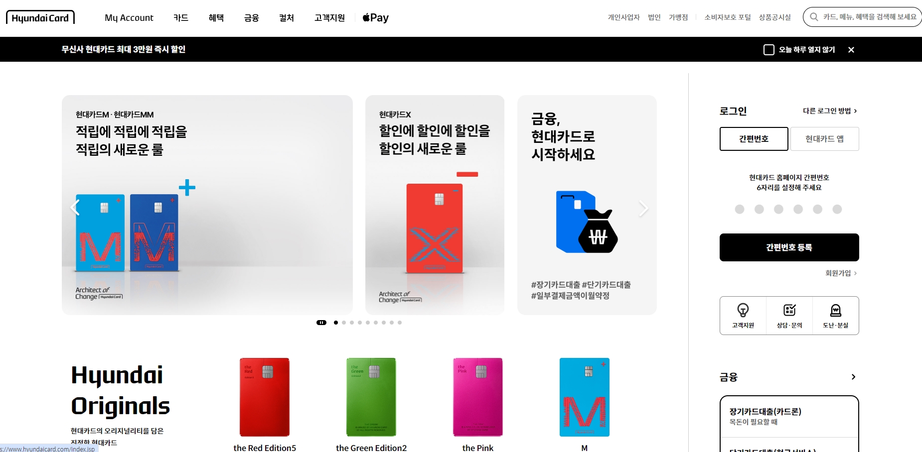현대카드 홈페이지에 접속해 보면 카드 발급부터 각종 혜택과 포인트 적립, 이벤트 소식, 현금서비스 정보까지 사용자가 필요로 하는 다양한 서비스를 쉽게 찾을 수 있습니다. 이곳에서는 사용자가 카드를 효과적으로 활용할 수 있도록 필요한 모든 정보를 한눈에 볼 수 있도록 구성되어 있습니다.