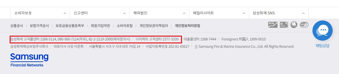 메인화면을 아래로 스크롤하면 고객 지원을 위한 다양한 연락처가 나타납니다. 삼성화재 고객콜센터는 1588-5114, 무료로 이용할 수 있는 번호는 080-900-7114이며, 해외에서의 문의는 82-2-2119-2000으로 연락하면 됩니다. 다이렉트 상품에 대한 문의는 1577-3339로 하면 됩니다.