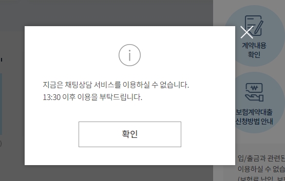 하지만, 채팅 상담 서비스는 특정 시간에만 이용 가능하며, 내가 확인했을 때는 점심시간으로 인해 13시 30분 이후에만 서비스를 이용할 수 있었습니다. 이는 채팅 서비스 이용을 계획하고 있는 사용자들이 상담 가능 시간을 사전에 확인해야 할 필요가 있음을 의미합니다.