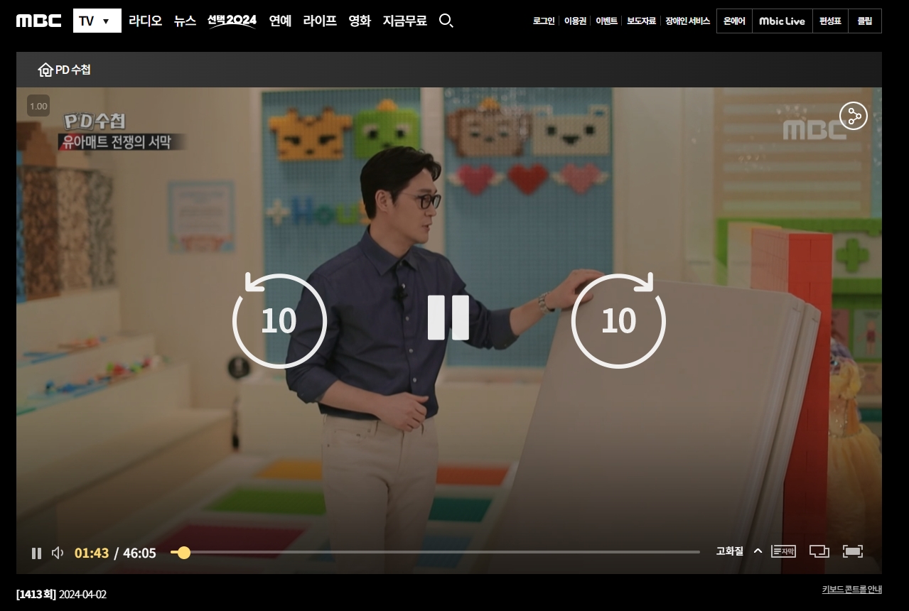 원하는 회차를 선택하면 해당 영상을 재생할 수 있으며, 비디오가 정상적으로 재생되는 것을 확인할 수 있습니다. 이는 대부분의 교양 프로그램이 MBC에서 유료로 제공되는 것과 대조적으로 PD수첩만의 특별한 무료 제공 정책을 반영한 것입니다.