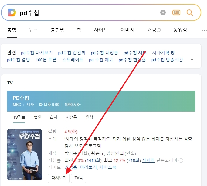 PD수첩을 온라인에서 찾기 위해서 검색엔진에 PD수첩을 입력하면 관련 프로그램 정보가 나타납니다. 이 페이지에서는 다시보기 기능을 바로 사용할 수 있는 버튼이 제공됩니다.