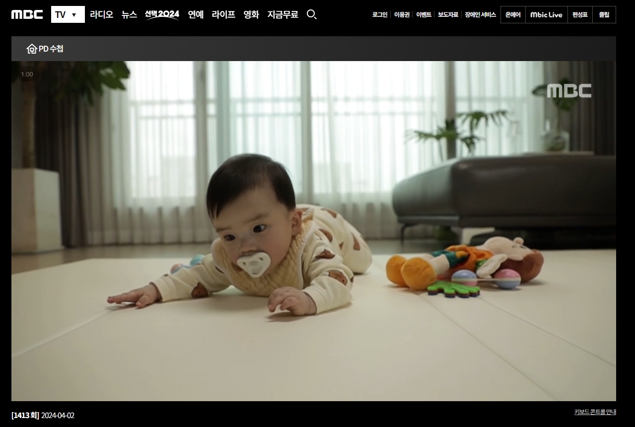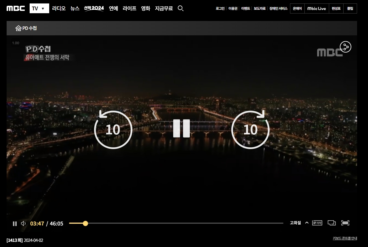 원하는 회차를 선택하면 해당 영상을 재생할 수 있으며, 비디오가 정상적으로 재생되는 것을 확인할 수 있습니다. 이는 대부분의 교양 프로그램이 MBC에서 유료로 제공되는 것과 대조적으로 PD수첩만의 특별한 무료 제공 정책을 반영한 것입니다.