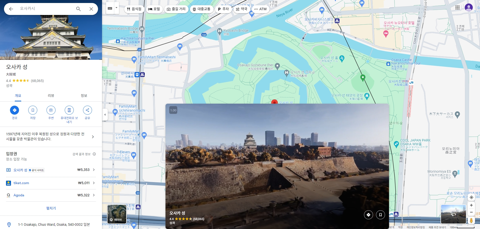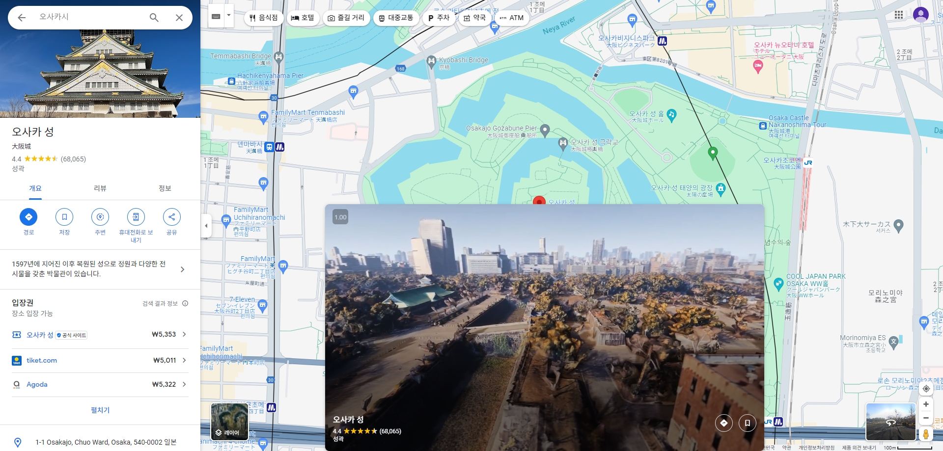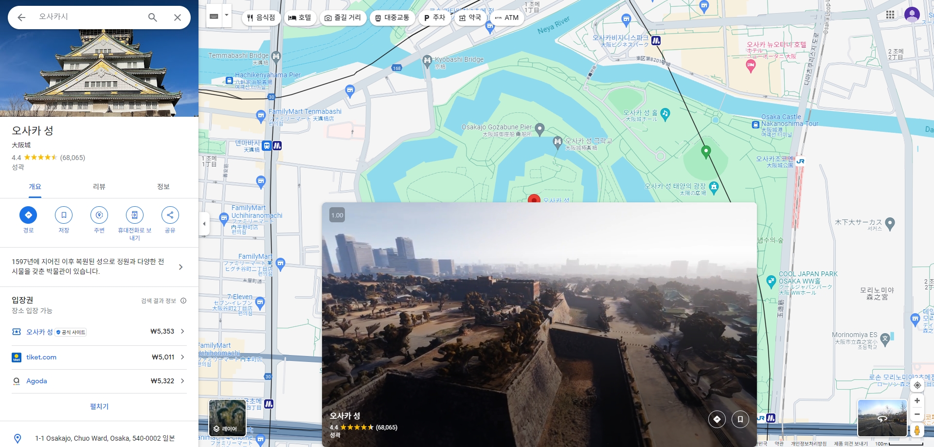 제가 특히 오사카성으로 지도를 이동시켜 보았습니다. 이동 후에는 오사카성 주변의 다양한 지역을 자유롭게 탐색할 수 있었으며, 지도 상에 한글 표기된 명소들도 쉽게 확인할 수 있었습니다.