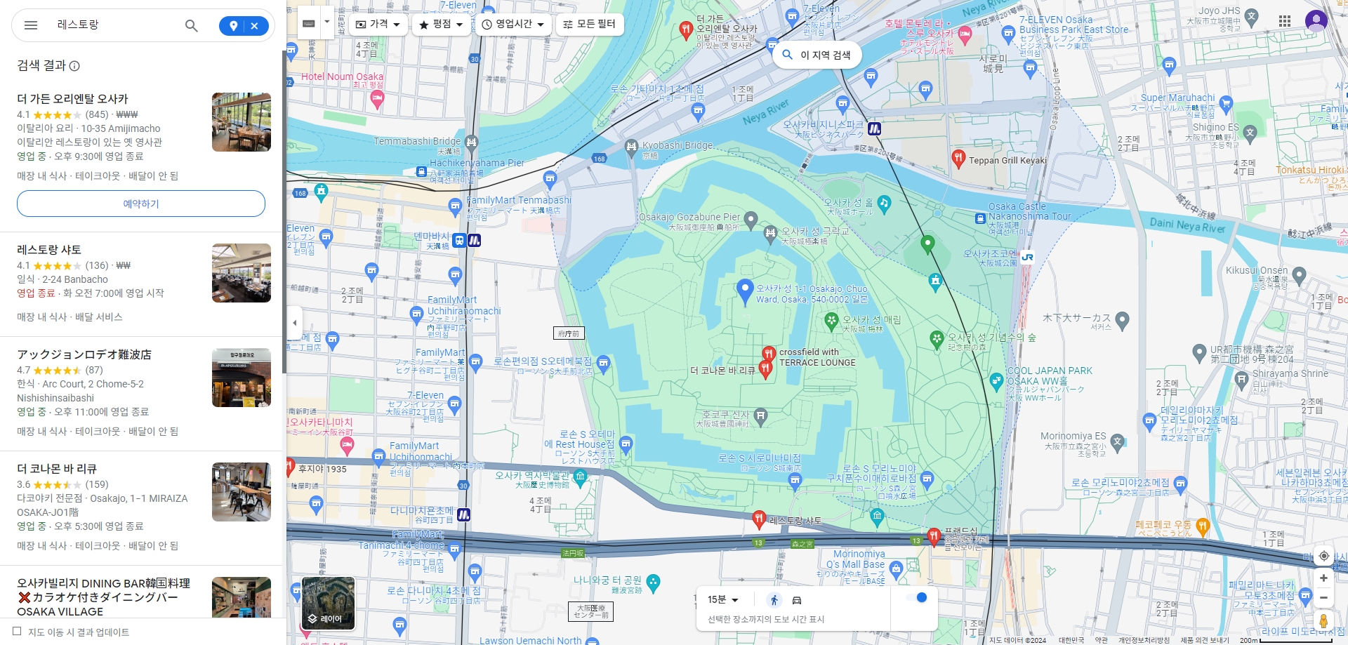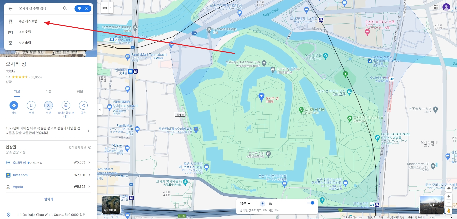 구글 지도의 또 다른 유용한 기능은 호텔, 식당 등의 상업 시설을 검색할 수 있다는 점입니다. 예를 들어, 오사카성 근처에서 식사를 하고 싶다면, 주변 버튼을 클릭하여 나타나는 레스토랑과 호텔 정보를 확인할 수 있습니다.