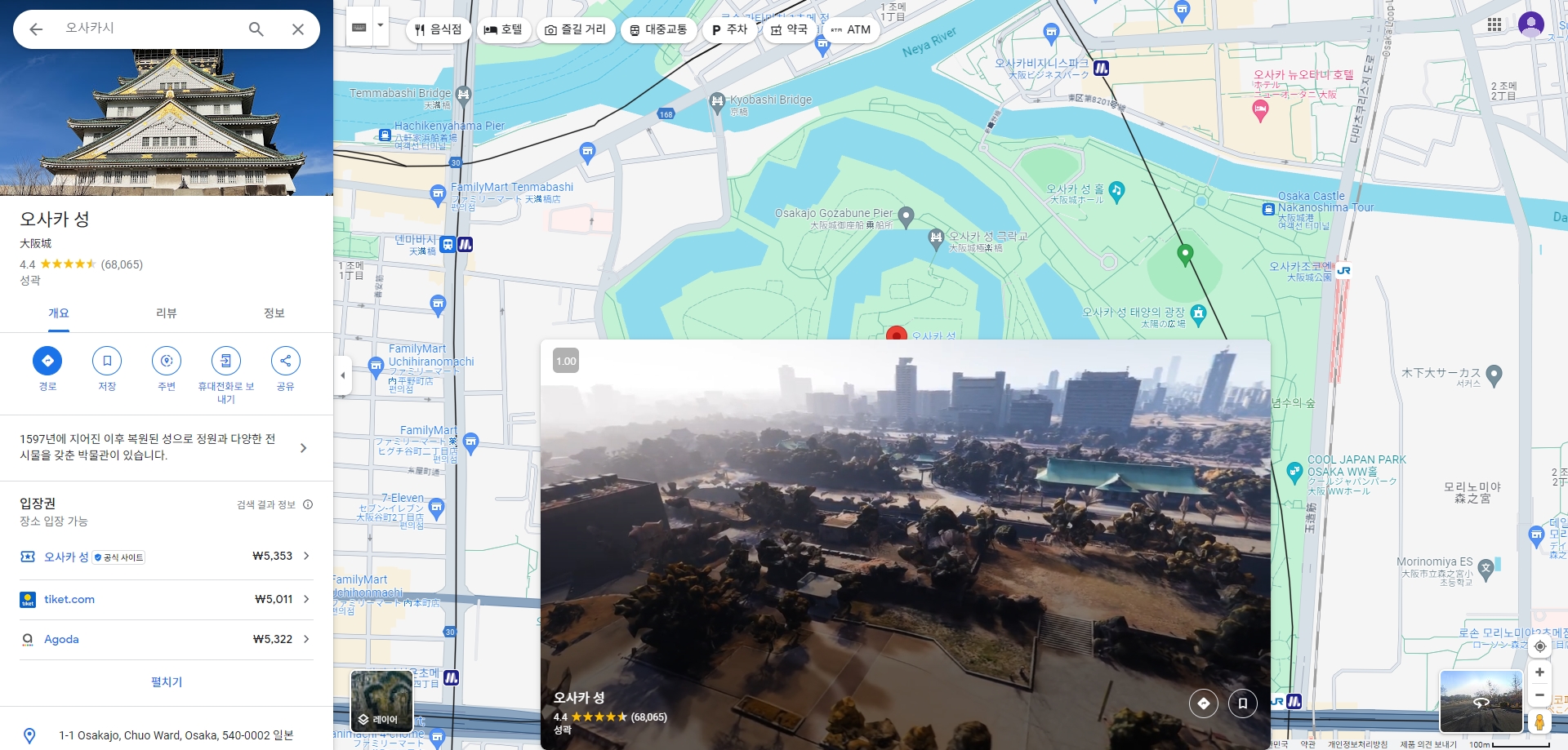 제가 특히 오사카성으로 지도를 이동시켜 보았습니다. 이동 후에는 오사카성 주변의 다양한 지역을 자유롭게 탐색할 수 있었으며, 지도 상에 한글 표기된 명소들도 쉽게 확인할 수 있었습니다.