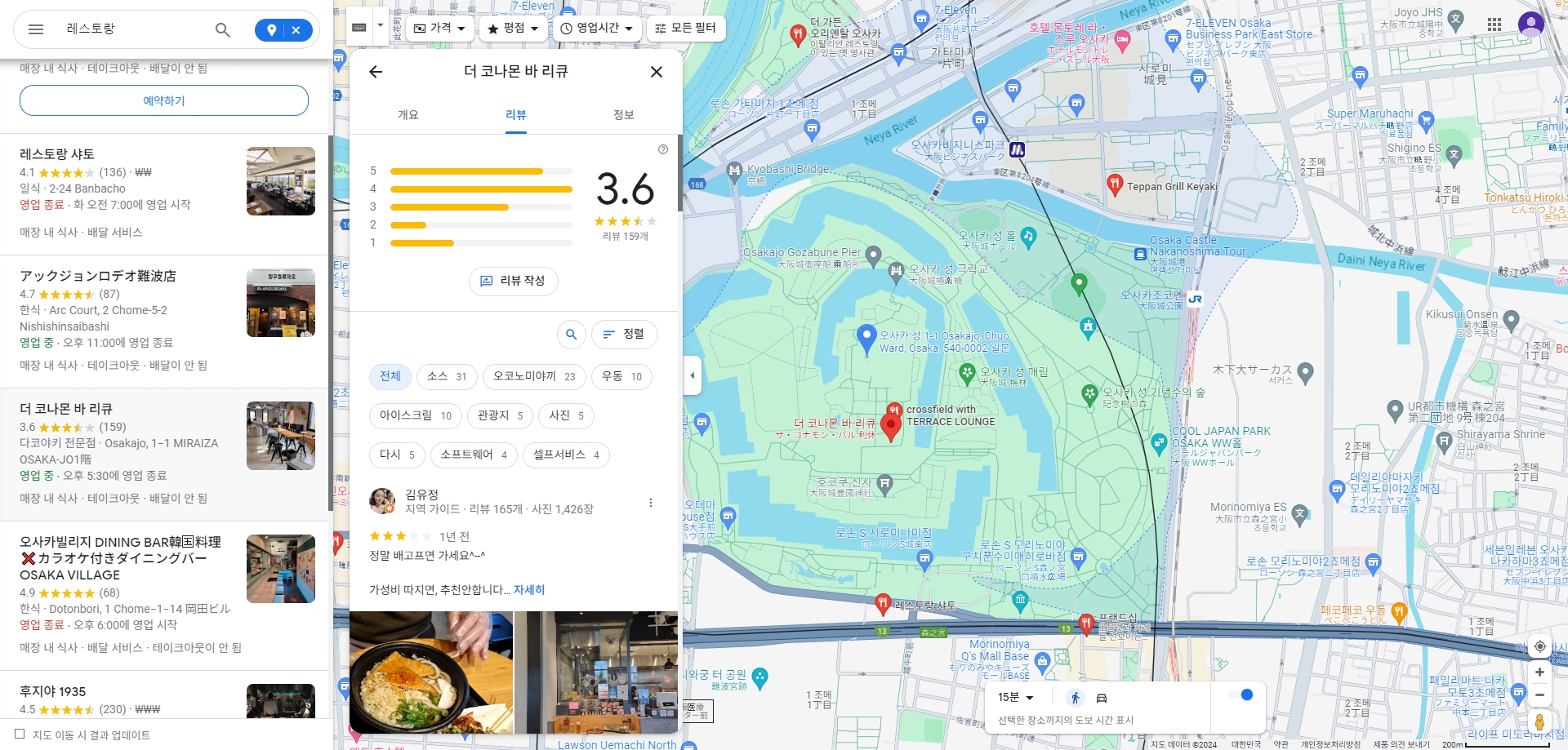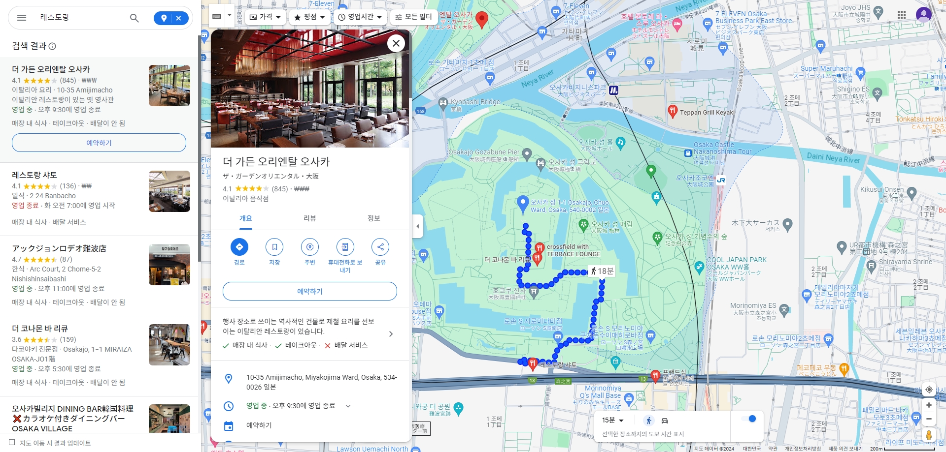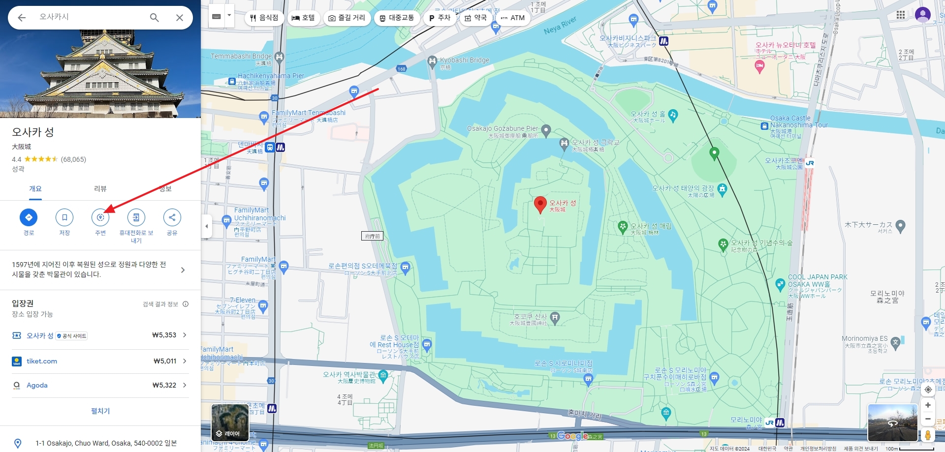 구글 지도의 또 다른 유용한 기능은 호텔, 식당 등의 상업 시설을 검색할 수 있다는 점입니다. 예를 들어, 오사카성 근처에서 식사를 하고 싶다면, 주변 버튼을 클릭하여 나타나는 레스토랑과 호텔 정보를 확인할 수 있습니다.