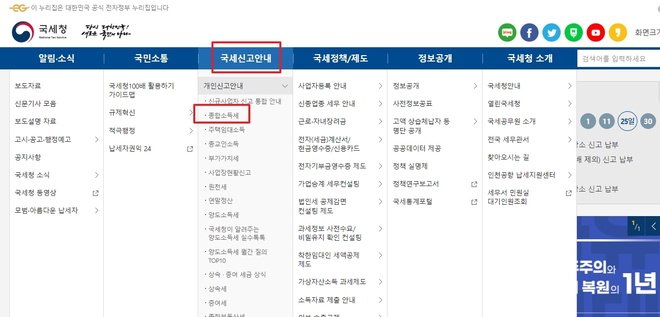 종합소득세 신고를 위해 국세청 홈페이지에 접속하면 다양한 메뉴가 있습니다. 여기서는 세금 신고에 필요한 정보를 찾을 수 있습니다. 메뉴에는 보도자료, 고시, 공고 등의 유용한 자료가 포함되어 있습니다.
