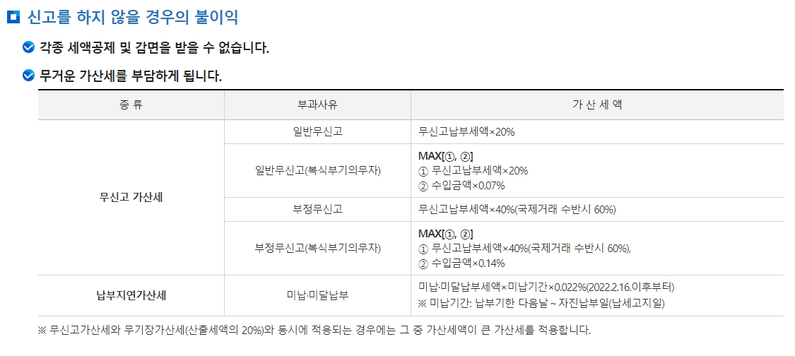 신고를 하지 않을 경우에는 세금 공제나 감면을 받지 못하며, 무신고 가산세를 비롯해 여러 가산세를 부담해야 합니다. 무신고납부세액의 20%에서 최대 수입금액의 0.07%까지, 부정 신고의 경우 최대 60%까지 부과될 수 있습니다. 지연된 납부에 대해서도 가산세가 부과됩니다.