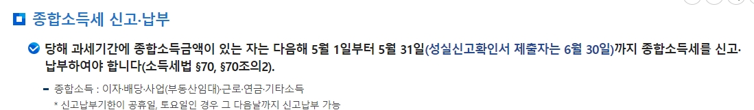 종합소득세는 그 해의 소득에 대해 다음 해 5월 1일부터 5월 31일까지 신고하고 납부해야 합니다. 성실신고확인서를 제출한 사람은 6월 30일까지 납부할 수 있습니다. 주의할 점은 신고납부 기한이 주말이나 공휴일인 경우, 다음 날까지 연장된다는 것입니다.
