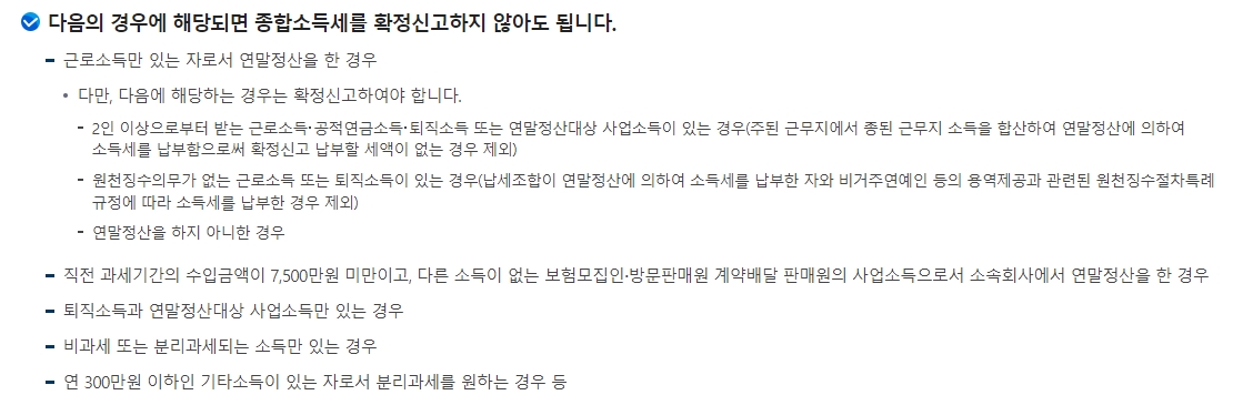 일정 조건에 해당하는 경우에는 종합소득세를 따로 신고하지 않아도 됩니다. 이 조건에는 연말정산을 완료한 근로소득자, 퇴직소득이나 연말정산 대상 사업소득이 있는 자 등이 포함됩니다. 그러나 연말정산을 하지 않았거나 특정 요건을 충족하는 경우에는 확정신고를 해야 합니다.