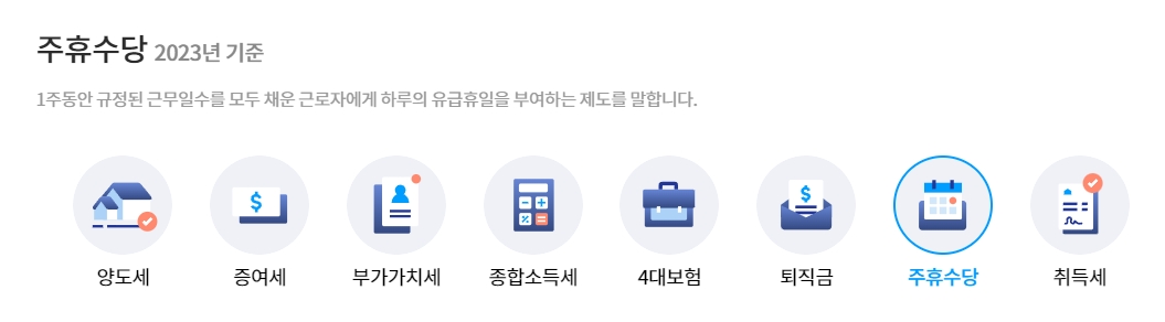 홈페이지의 상단 메뉴에서 자동세금계산기 섹션을 찾아 주휴수당을 클릭합니다. 주휴수당 계산기는 근로기준법에 따라 주휴수당을 계산해주는 편리한 도구입니다.