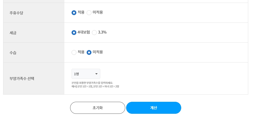 계산 전에 주휴수당의 적용 여부와 세금 공제 여부, 수습 기간의 적용, 부양 가족의 수 등의 변수를 선택하여 입력합니다. 이는 계산 결과에 영향을 미치는 중요한 조건들입니다.