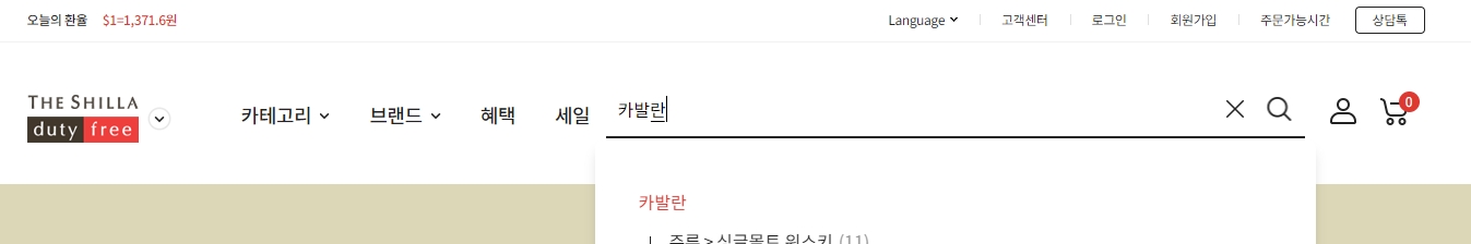 면세점의 검색창에도 ‘카발란’을 검색했습니다.