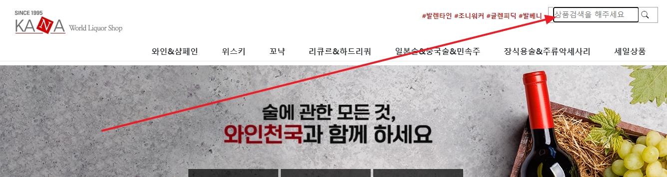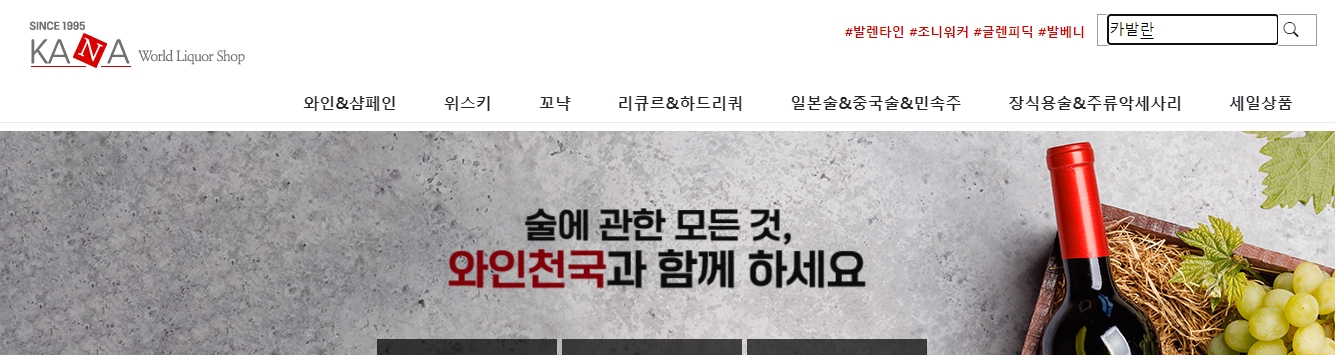 주류백화점 홈페이지의 우측 상단 검색창에 ‘카발란’이라고 입력했습니다.