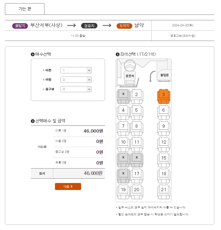 이 중에서 자신에게 맞는 버스를 골라서 예매 인원수를 정하고 좌석을 선택한 다음 결제를 하면 예매가 완료됩니다. 예약 절차가 생각보다 간편해서 편리하더라고요.