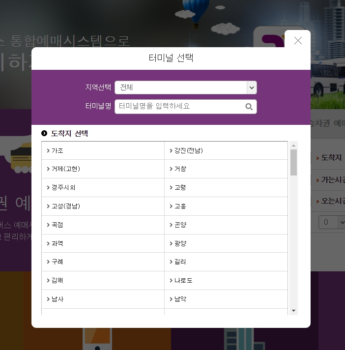 이어서 도착지를 선택해야 하는데요, 부산서부에서 출발하는 노선에서 갈 수 있는 목적지만 나타나서, 그 중에서 원하는 목적지를 골라야 합니다.