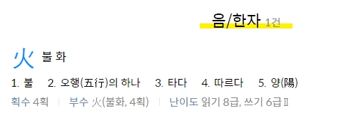 한글로 한자를 찾고자 할 때는 불 또는 화와 같은 키워드로 검색하면 관련 한자 목록을 조회할 수 있으며, 이 중에서 원하는 한자를 선택하여 그 의미를 확인할 수 있습니다.