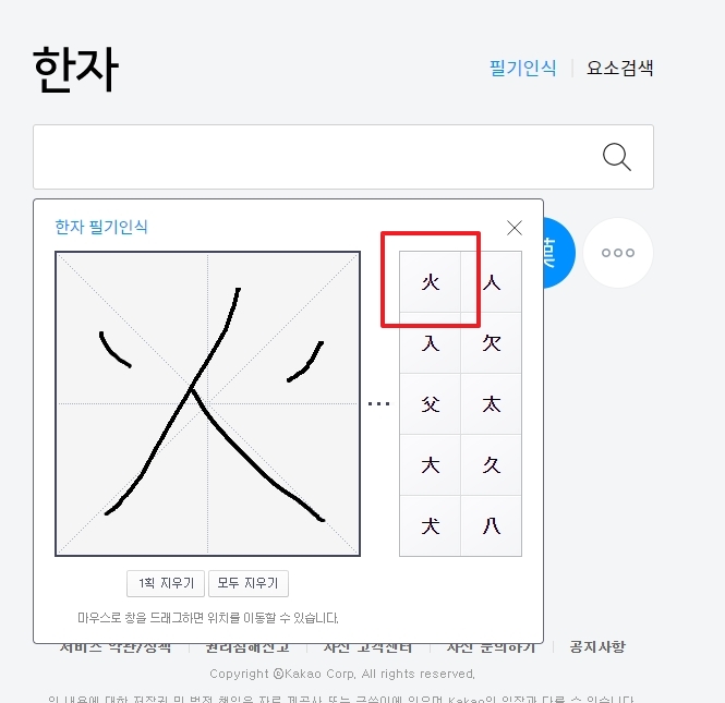 한자를 클릭하면, 그림 입력 창은 사라지고 선택한 한자가 검색창에 자동으로 입력됩니다. 이후 돋보기 아이콘을 클릭하여 한자를 검색하면 됩니다.
