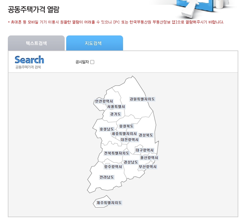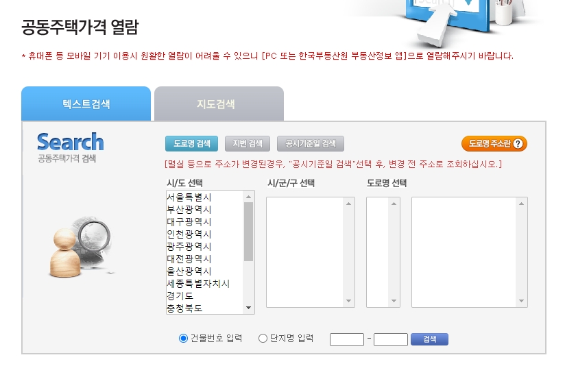 공시지가를 조회하는 방법에는 두 가지가 있습니다. 텍스트 검색을 통해 시도, 시군구, 도로명을 선택하여 검색할 수 있고, 지도검색을 이용하면 지도 상에서 시도, 시군구, 읍면동을 선택한 뒤 아파트 단지 이름을 검색할 수 있습니다.