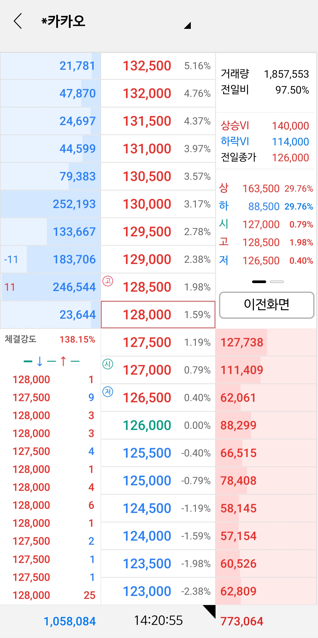 카카오의 호가창을 보면, 체결강도가 138.15%라는 것을 확인할 수 있습니다. 이는 매수체결량이 매도체결량보다 많아 100%를 초과하는 경우로, 매수자가 매도자보다 많은 상황을 나타냅니다.