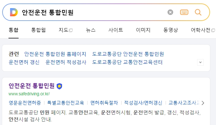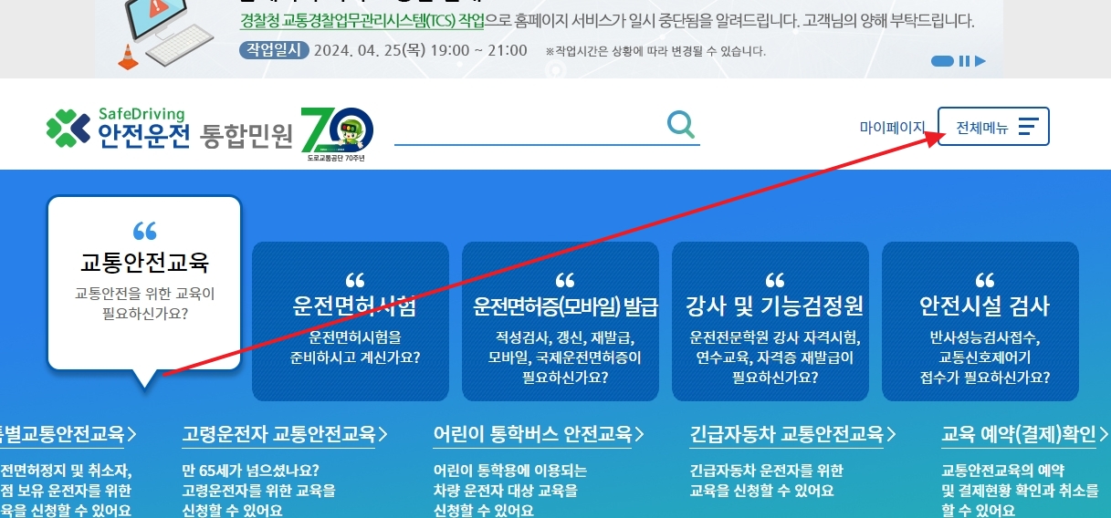 안전운전 통합민원 홈페이지로 들어갑니다. 이 홈페이지는 도로교통공단이 운영하며, 교통안전교육, 운전면허시험, 면허 발급, 갱신, 적성검사, 안전시설 검사에 대한 정보를 제공합니다.