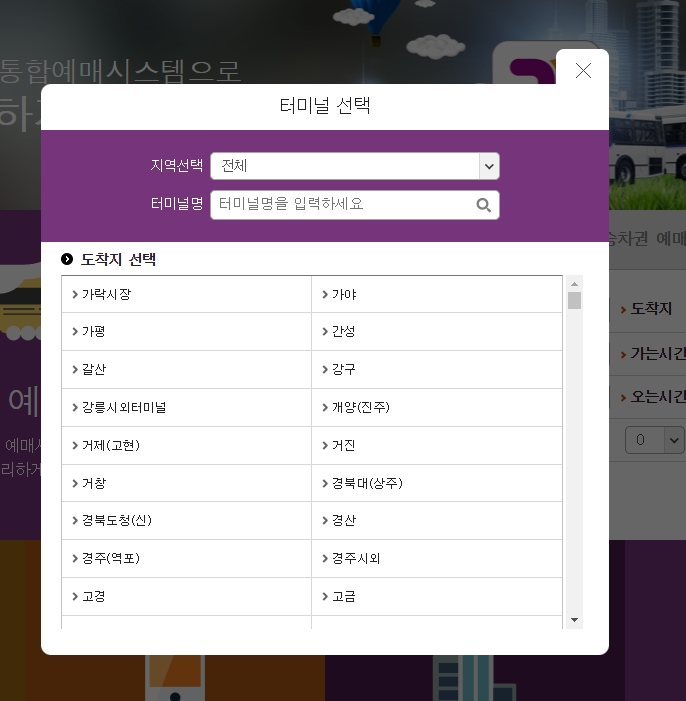이후 도착지 선택에서 동대구 터미널에서 갈 수 있는 목적지 목록이 나타나며, 원하는 목적지를 클릭하여 선택할 수 있습니다.