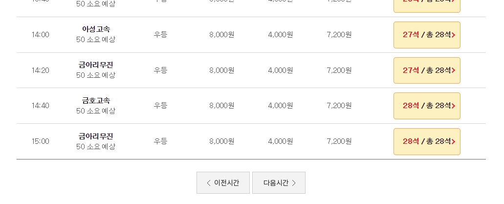화면을 아래로 스크롤하면 시간표가 한 페이지에 모두 표시되지 않을 경우 다음 시간, 이전 시간 버튼을 통해 추가 시간표를 확인할 수 있습니다. 이 버튼들을 클릭하면 다른 시간대의 버스 출발 정보를 볼 수 있어, 사용자가 원하는 시간대를 찾는 데 도움이 됩니다.