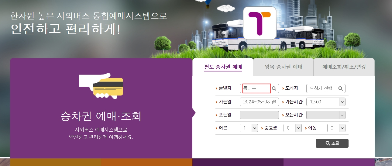 승차권 예매를 위해 출발지 선택에서 동대구를 검색하고 클릭합니다. 이렇게 하면 동대구 시외버스 터미널을 출발지로 설정할 수 있습니다.