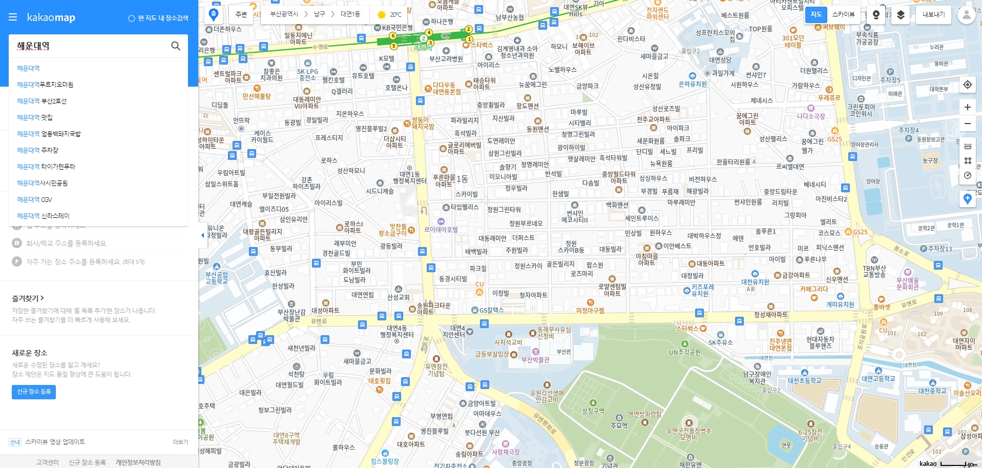 좌측 검색창을 사용하여 출발하려는 장소나 도착하려는 장소를 검색합니다. 예를 들어, 해운대역을 검색하여 해당 위치를 찾아볼 수 있습니다.
