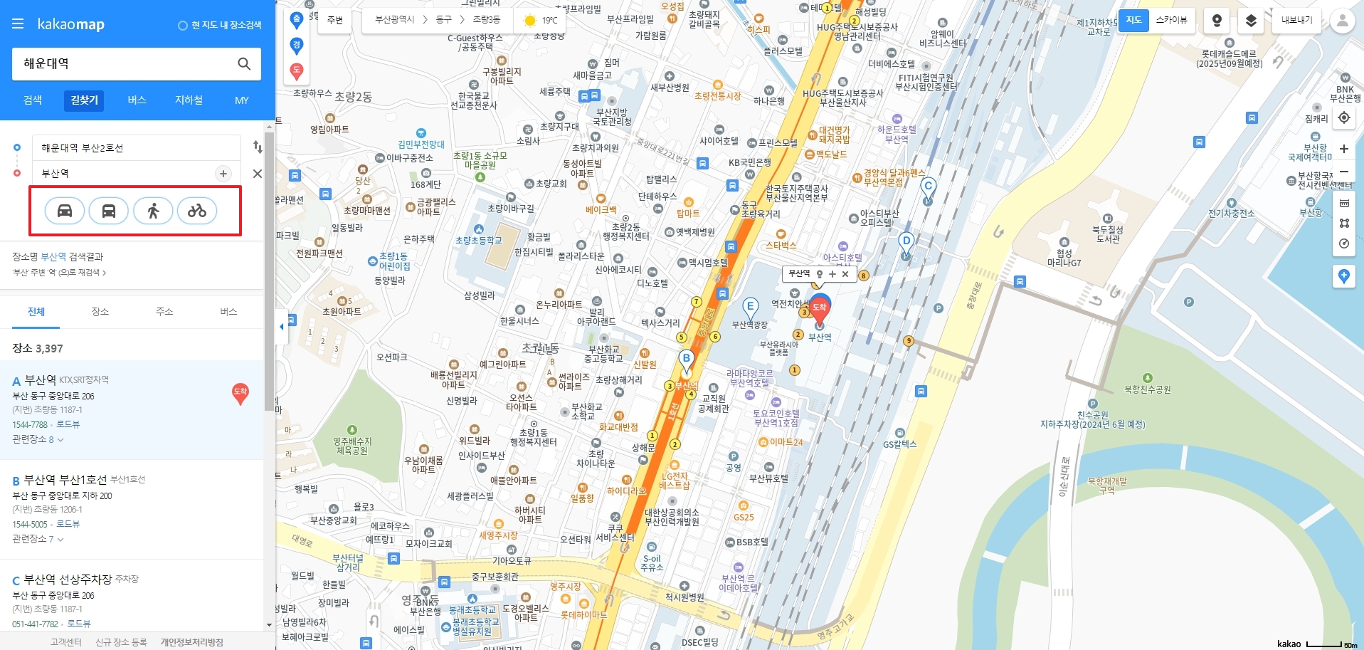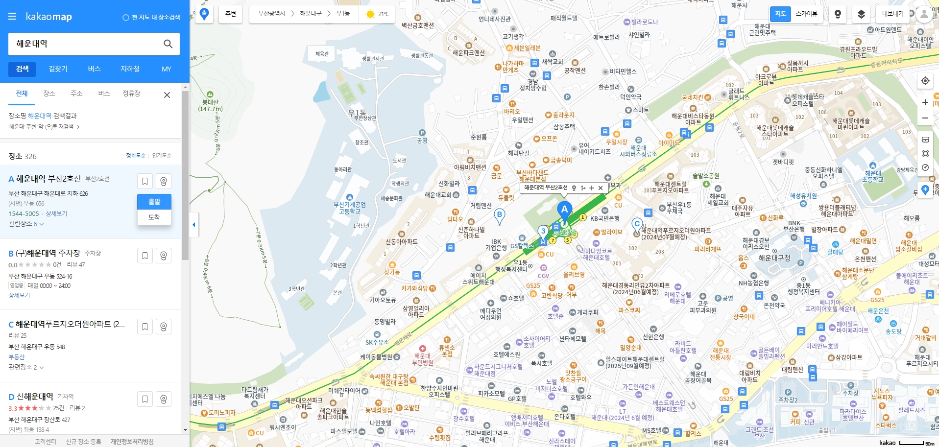 좌측 검색창을 사용하여 출발하려는 장소나 도착하려는 장소를 검색합니다. 예를 들어, 해운대역을 검색하여 해당 위치를 찾아볼 수 있습니다.