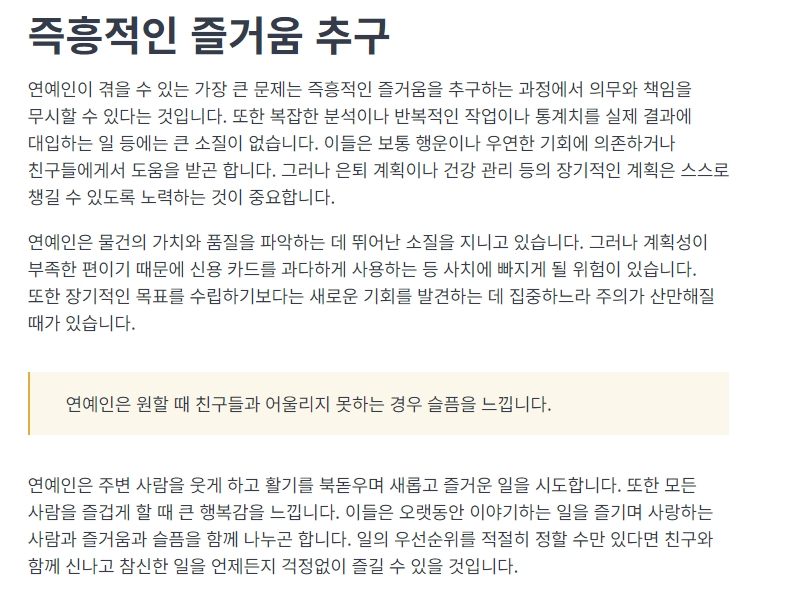 예를 들어, ESFP (연예인) 유형은 즉흥적으로 노래하고 춤을 추며 즐거움을 추구하는 성격을 가지고 있으며, 다른 사람들도 자신과 같은 즐거움을 느낄 수 있기를 바랍니다.