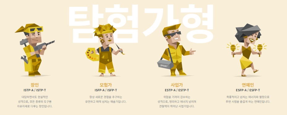 탐험가형에는 ISTP (장인), ISFP (모험가), ESTP (사업가), ESFP (연예인)가 포함되어 있으며, 이들은 대담하고, 유연하며, 즉흥적이고, 에너지 넘치는 특성을 가지고 있습니다.