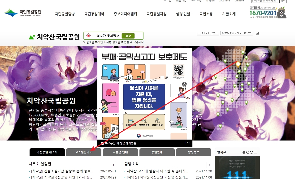 홈페이지 메인화면에서 코스별 난이도를 클릭하면 다양한 등산 코스와 그 난이도를 확인할 수 있습니다. 이 부분에서 국립공원 새소식을 확인하면 탐방 금지 기간 등 중요한 정보를 얻을 수 있습니다.