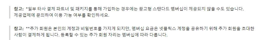 일부 결제 파트너를 통해 가입할 경우 광고형 스탠다드 멤버십이 제공되지 않을 수 있으며, 추가 회원은 자신의 계정과 비밀번호를 가지게 되지만 멤버십 요금은 초대한 사람이 결제합니다. 추가 회원 자리는 멤버십에 따라 다르게 제공됩니다.