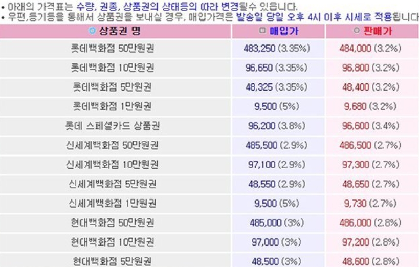 인터넷에 돌아다니는 정보를 보면 보통 3% 정도를 떼고 주는 듯합니다. 때마다 다르고 지역마다 다르며 가게마다 조금씩 다르지만, 보통 신세계상품권 100만 원을 판다고 하면 96~97만 원을 받을 수 있다고 생각하면 됩니다.