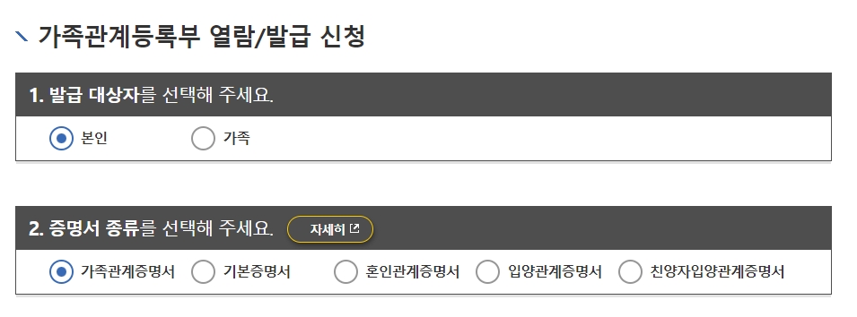 발급대상자를 선택합니다. 발급대상자는 가족과 본인으로 나뉘며, 증명서 종류는 가족관계증명서, 기본증명서, 혼인관계증명서, 입양관계증명서, 친양자입양관계증명서가 있습니다.
