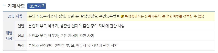 일반, 상세, 특정의 경우 기재사항 견본보기를 통해 가족관계증명서(일반, 상세, 특정)의 공통 기재사항과 개별 기재사항에 대한 정보를 확인할 수 있습니다. 일반증명서는 본인과 부모, 배우자, 생존한 현재의 혼인 중의 자녀에 관한 사항이 기재됩니다. 상세증명서는 본인과 부모, 배우자, 모든 자녀에 관한 사항이 기재됩니다. 특정증명서는 본인과 신청인이 선택한 부, 모, 배우자 및 자녀에 관한 사항이 기재됩니다. 특정증명서는 등록기준지와 본 포함 여부를 선택할 수 있습니다.