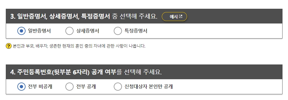 증명서 종류를 선택한 후 일반증명서, 상세증명서, 특정증명서 중 하나를 선택하고, 주민등록번호 뒷부분 6자리 공개 여부를 선택합니다.