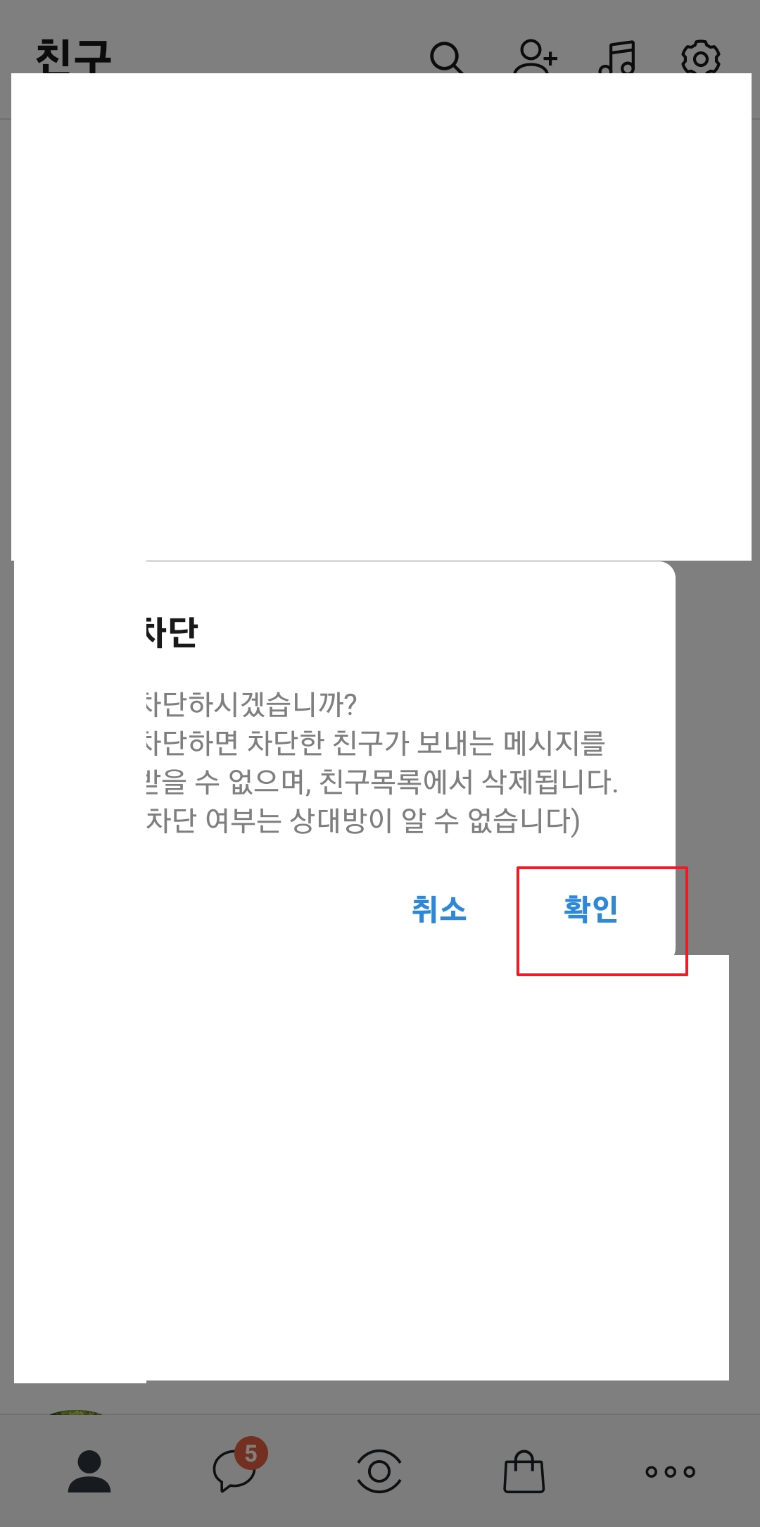차단을 누르면 차단하시겠습니까?라는 확인 메시지가 뜨고, 여기서 확인을 클릭합니다. 이 과정을 통해 최종적으로 친구를 차단할 수 있습니다.
