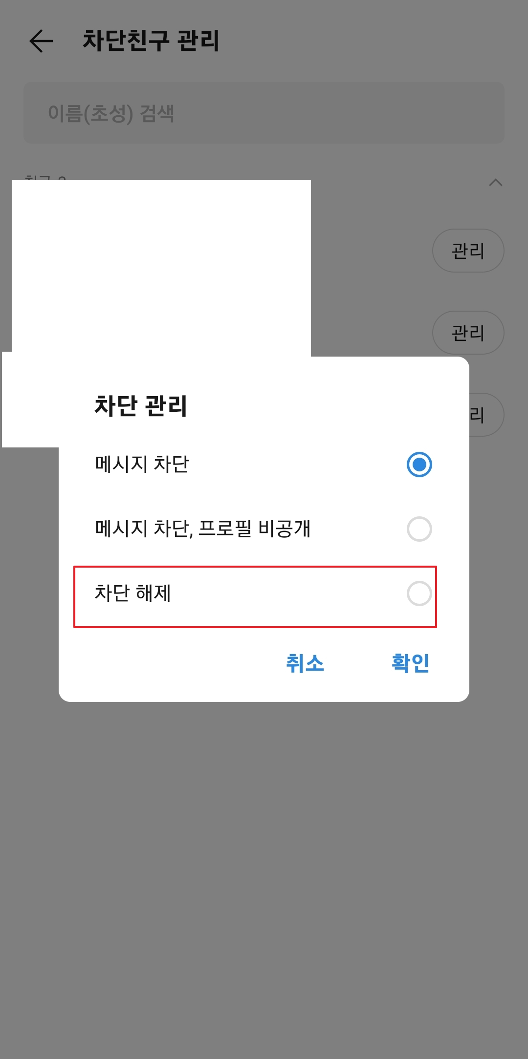 관리 메뉴에서는 기본적으로 메시지 차단이 설정되어 있습니다. 메시지 차단, 프로필 비공개, 차단 해제 옵션이 있으며, 여기서 해제를 선택한 후 확인을 클릭하면 됩니다.
