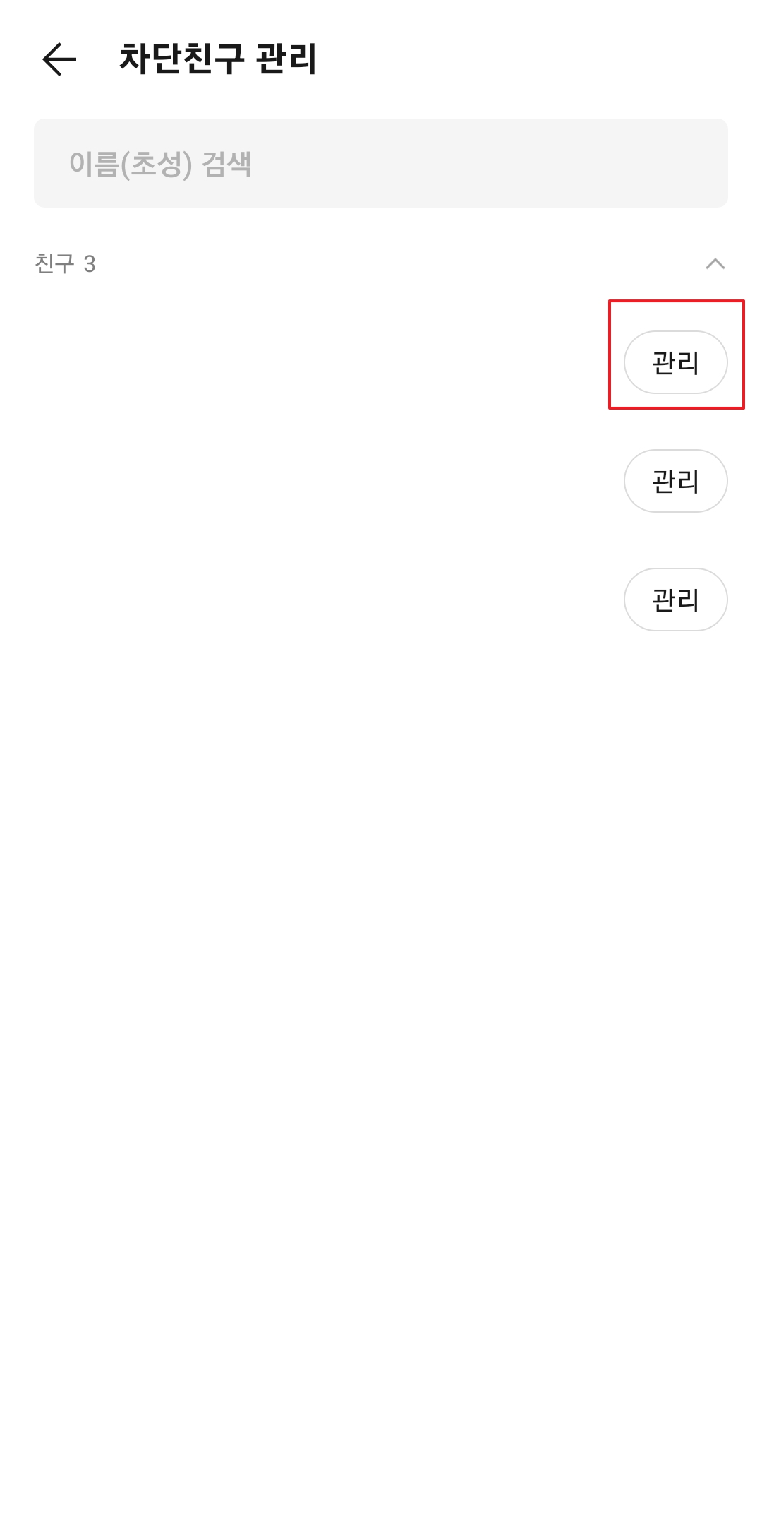 차단친구 관리창에 들어가면 아까 차단한 친구가 리스트에 나타납니다. 여기서 관리를 클릭합니다.