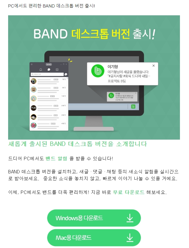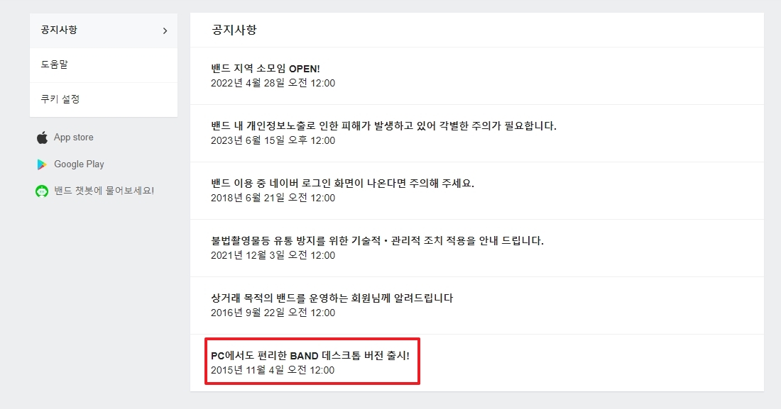 공지사항의 가장 아래에 있는 "PC에서도 편리한 BAND 데스크톱 버전 출시"를 클릭합니다. 이 항목은 PC 버전의 밴드 사용에 관한 정보가 포함되어 있습니다.