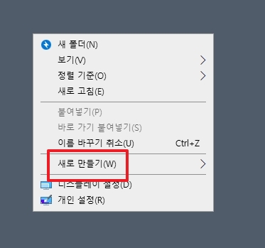 컴퓨터 바탕화면으로 나와서 바탕화면 빈 곳에 마우스 우클릭을 합니다. 메뉴가 나타나면 새로 만들기를 선택한 후 바로가기를 클릭합니다.