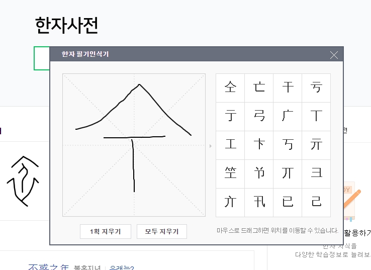 한자를 클릭하면 그 한자가 검색창에 입력됩니다. 인식기를 닫으려면 x 버튼을 눌러 꺼야 하는데, 인터페이스가 다소 불편할 수 있습니다.