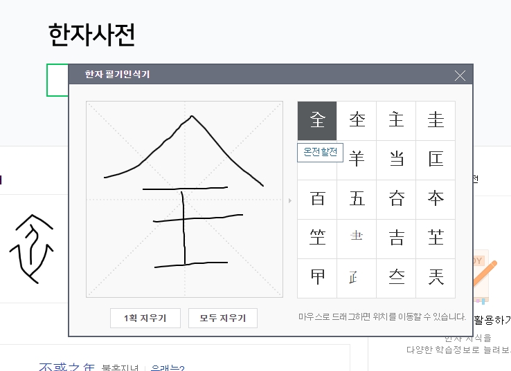 한자를 다 그렸지만 한 획을 일부러 덜 그어 봤습니다. 온전할 전(全)이 그대로 나오는 것을 확인했습니다. 다만 아쉬운 점은 쇠 금(金)도 나올 법한데 나오지 않는 경우가 있었습니다.