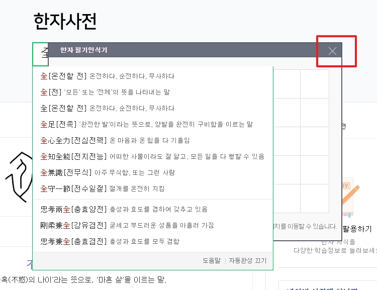 한자를 클릭하면 그 한자가 검색창에 입력됩니다. 인식기를 닫으려면 x 버튼을 눌러 꺼야 하는데, 인터페이스가 다소 불편할 수 있습니다.