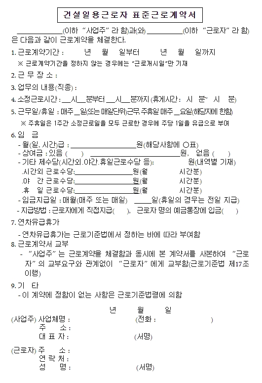 두 번째 양식은 건설일용근로자를 위한 계약서로, 일반적으로 노가다꾼이라고 불리는 건설 현장 근로자를 위한 특화된 계약서입니다. 실제 현장에서는 구두로 일하는 경우가 많으나 법적 보호를 받기 위해서는 서면 계약이 중요합니다.