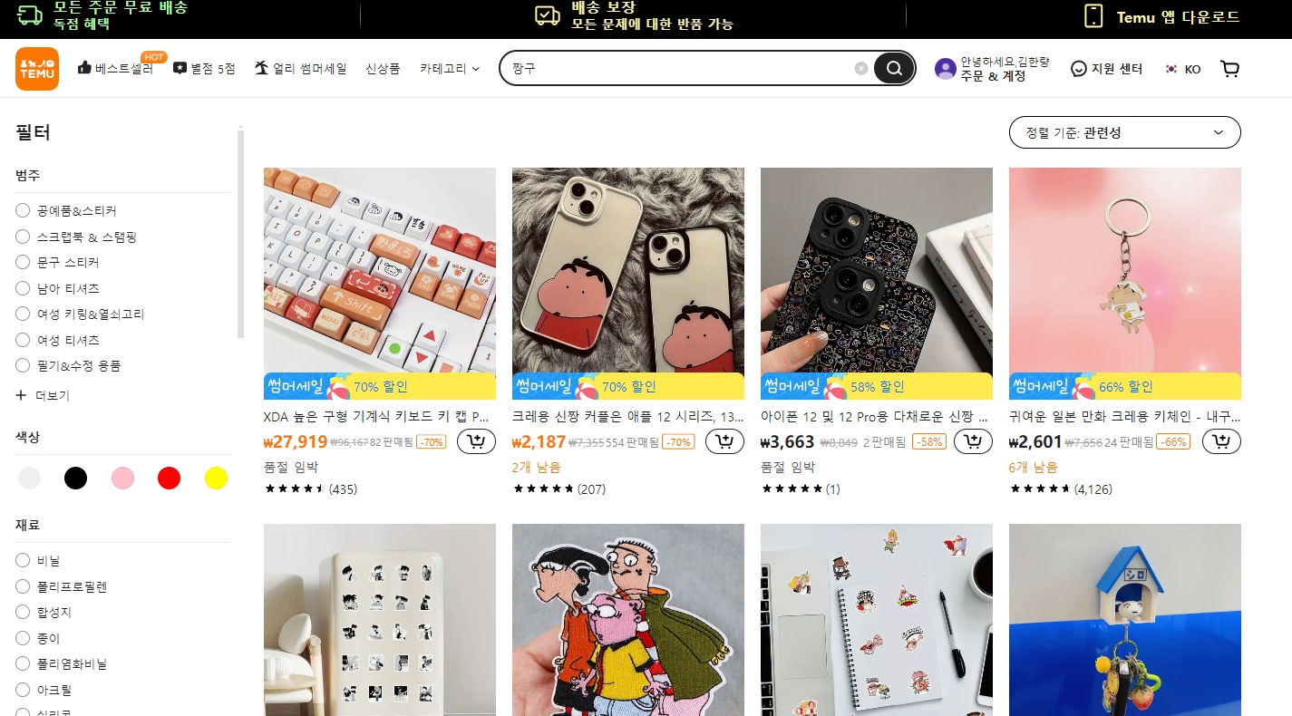 테무의 가장 아쉬운 점은 검색 기능입니다. 검색이 제대로 작동하지 않아서 불편함이 있습니다. 사진 검색 기능이라도 있었으면 좋겠습니다.